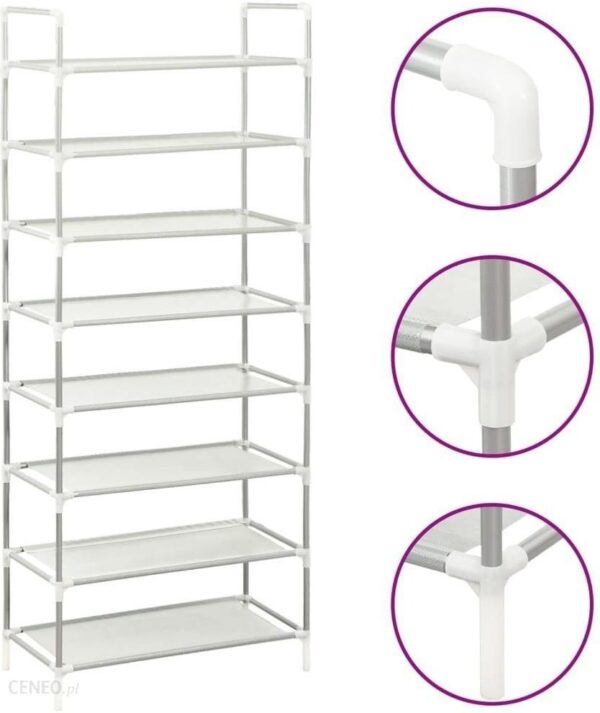 Ten minimalistyczny stojak na buty to idealne rozwiązanie na przechowywanie Twojego obuwia.Organizer na buty ma ramę z metalowych rurek, która jest lekka i wytrzymała, dzięki czemu stojak można z łatwością przestawiać i jest on dość stabilny. 8 obszernych półek wykonanych z przyjaznej dla środowiska włókniny oferuje sporo miejsca na poukładanie butów.Kolor: srebrny Materiał: metal, włóknina (100% poliester), tworzywo sztuczneWymiary: 60 x 28 x 140 cm (dł. x szer. x wys.)Posiada 8 półek i 2 uchwytyWymagany montaż: takOSTRZEŻENIE: aby zapobiec przewróceniu się produktu, musi on zostać przymocowany do ściany za pomocą dołączonego elementu
