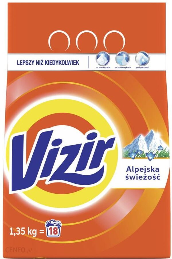 Vizir Alpine Fresh to niezwykle skuteczny proszek do prania.Środek piorący natychmiast zapewni Twoim ubraniom nieskazitelną czystość oraz pozostawi je w doskonałej kondycji na długi czas.Został opracowany w taki sposób abyś z całą rodziną zawsze prezentowała się jak najlepiej. Vizir Alpine Fresh jest proszkiem przeznaczonym do prania białych oraz jasnych tkanin. Innowacyjny produkt w postaci proszku do prania Alpine Fresh od marki Vizir:-szybko i skutecznie usuwa nawet najbardziej uporczywe plamy-zwalcza najbardziej uporczywe zabrudzenia nawet z miejsc najtrudniejszych do wyprania (mankietów, kołnierzyków, pach)-odświeża tkaniny-zachowuje odpowiednią kondycję pranych tkanin-uprzyjemnia noszenie ulubionej odzieży, otulając ją obłędnym zapachem, który z pewnością przypadnie Tobie do gustu! Proszek do prania o pojemności 1.35kg. Starcza na 18 prań