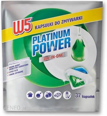 Kapsułki do Zmywarki W5 Platinum Power 37 sztuk:- Kapsułki do mycia naczyń W5 łączą płyn i proszek, zapewniając doskonały efekt mycia.- Dzięki kapsułkom można w jednym procesie mycia usunąć wszystkie resztki potraw i uzyskać lśniąco czyste naczynia.- Skuteczne również w krótkich cyklach mycia i niskiej temperaturze.- Gotowe do użycia – nie trzeba ich rozpakowywać.- Neutralizują nieprzyjemny zapach.- 1 kapsułka = 1 zmywanie- Opakowanie zawiera 37 kapsułek.