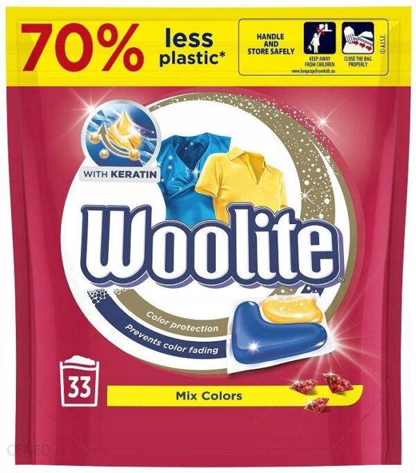 Woolite Mix Colors z keratyną Kapsułki do kolorowych tkanin 33 sztukiZalety produktu:- Skuteczność usuwania plam- ochrona tkanin- z dodatkiem keratyny- wyłapują barwniki – zapobiegają farbowaniu- utrzymują intensywność kolorów- działają w zimnej wodzieŻelowe kapsułki do prania Woolite do Kolorów z Keratyną skutecznie piorą i utrzymują intensywność kolorów Twoich ubrań. Unikalna formuła kapsułek zapewnia ochronę przed utratą barwników w ubraniach, zachowując ich nowy wygląd na dłużej. Keratyna zawarta w kapsułkach do prania Woolite wygładza włókna i nadaje im blask.Forma kapsułki ułatwia rozpuszczanie się, dzięki czemu nie zobaczysz śladów detergentu po wyjęciu ubrań z pralki.Składniki wyłapujące barwniki zapobiegają zafarbowaniu jaśniejszych elementów na ubraniach. Koniec z niewłaściwym dozowaniem – wygodną w użyciu kapsułkę wystarczy umieścić w bębnie pralki. Kapsułka szybko rozpuszcza się podczas prania nawet w zimnej wodzie.Włosy zasługują na specjalne traktowanie, dlaczego nie zadbać o ubrania tak samo?Dzięki swym wyjątkowym właściwościom, Keratyna jest chętnie wykorzystywana przez największych światowych producentów kosmetyków do pielęgnacji włosów. Skutecznie o nie dba, pomaga chronić, nawilża, wygładza i regeneruje. Skoro Keratyna działa tak świetnie na włosy to czemu nie wykorzystać jej w produktach do prania?Jak używać kapsułek do prania?Dozowanie (dla wszystkich stopni twardości wody):- Należy wrzucić 1 kapsułkę w pustym bębnie pralki przed załadowaniem prania. Nie wrzucaj kapsułki do szufladki na detergent. Nie dotykaj kapsułek mokrymi rękami.- Wrzuć 1 kapsułkę Woolite – 1 pranie dla standardowego wsadu pralki 4,5 kg.- Wrzuć 2 kapsułki Woolite – dla wsadu pralki powyżej 5 kg. Przy średnich zabrudzeniach i dla średnio twardej wody.
