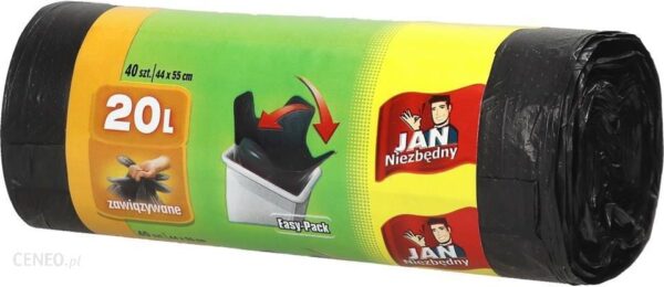 Worki na śmieci Jan Niezbędny. Praktyczny sposób na gromadzenie i segregowanie odpadów różnego rodzaju.Pojemność: 20 litrówKolor: czarnyTworzywo: polietylen HDPEWorki z końcówkami ułatwiającymi zawiązywanie (Easy Pack)Ilość: 40 szt.