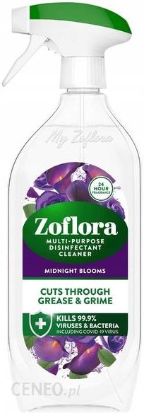 ZOFLORA Midnight BloomsŚrodek dezynfekujący 800mlWygodny, gotowy do użycia spray jest idealny do miejsc o dużym natężeniu ruchu i sprzątania w całym domu i miejscu pracy. Eliminuje również nieprzyjemne zapachy i pozostawia pięknie pachnące przestrzenie przez cały dzień.Wielofunkcyjny skoncentrowany środek usuwa 99% bakterii, wirusy i zapachy zwierząt domowych.Przeznaczenie preparatu dezynfekującego:usuwa 99,9% bakterii i wirusów – Covid-19, bakterie E.coli, salmonellę, gronkowca złocistegotłusty bruddo stosowania na podłogach, kafelkach, wannach, prysznicach w łazienkachdo mycia kuchennych blatów i miejsc gdzie przechowujemy i przygotowujemy żywnośćnie zastąpiony do utrzymania czystości w pokoju dziecięcym, mycia łóżeczka, nocnikadoskonały do gabinetów fryzjerskich, kosmetycznych oraz lekarskicheliminuje nieprzyjemne zapachyśrodek dezynfekujący Zoflora może być stosowany na podłogach, wannach, kafelkach, kranach, blatach, odpływach, ścierkach, toaletach i nocnikachbezpieczny do stosowania na powierzchniach twardych gdzie przebywają zwierzęta domowezapachy zostały opracowane przez ekspertów od perfumskuteczny do mycia kranów i armatury łazienkowej, toalety, odpływydo odkażania gąbek i ściereczekSposób użycia:Spryskać powierzchnie i przetrzeć czystą wilgotną szmatką lub gąbką. W przypadku uporczywych plam i tłuszczu spryskaj i pozostaw na 2 minuty przed wytarciem.