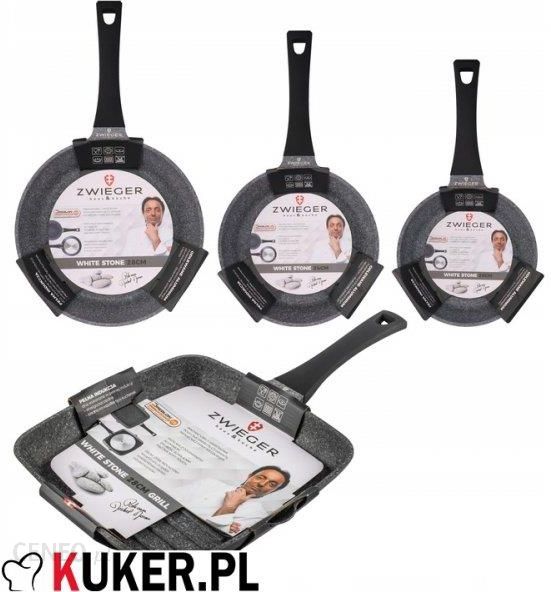 Zestaw 4 Patelni ZWIEGER White StoneZestaw patelni ZWIEGER White Stone składający się z:Patelnia ZWIEGER White Stone 28 cmPatelnia ZWIEGER White Stone 24 cmPatelnia ZWIEGER White Stone 20 cmPatelnia ZWIEGER White Stone Grill 28 cmCechy i zalety patelni ZWIEGER White Stone:Patelnie ZWIEGER White Stone z odlewanego aluminium. Nowoczesna, trzywarstwowa powłoka granitowa GREBLON C3 GRANITE pokrywa wewnętrzną część patelni.Dzięki nowatorskiej technologii, pozwalającej zredukować ilość powłok do trzech warstw, patelnie doskonale przewodzą i akumulują ciepło.Ze względu na swoje wyjątkowe właściwości, zwiększające odporność na zarysowania, powłoka GERBLON C3 GRANITE stosowana jest w naczyniach najwyższej klasy.Dodatkowo, żaroodporny lakier silikonowy, który pokrywa patelnię na zewnątrz, sprawia, że zachowuje ona swój estetyczny wygląd na długie lata.Solidne patelnie Zwieger z odlewanego aluminium, z innowacyjną trzywarstwową powłoką Greblon® C3 GRANITE non-stick firmy WEILBURGERMaksymalna temperatura pracy 240 °CRączka została wykonana z materiału PP, który nie przewodzi ciepła, a dodatkowo posiada specjalną powłokę soft touch zapewniającą wygodny i pewny chwytOdlewane aluminium typu die cast – lepsza struktura przewodzenia i dystrybucji ciepłaPowłoka nieprzywierająca, 3 – warstwowa Greblon® C3 GRANITE – powłoka najwyższej jakości do zastosowań profesjonalnychWyjątkowa, nowatorska powłoka patelni zapobiega przywieraniu przygotowywanych produktów, a więc jej czyszczenie jest wygodne, a przede wszystkim szybkie (przygotowywane produkty nie przywierają do patelni)Efekt granitu – zastosowana powłoka, przez swoją specyficzną, chropowatą powierzchnię, pozwala przygotować potrawy panierowane łatwiej i lepiej niż na tradycyjnych, płaskich powierzchniachSmażenie w niskich temperaturach przy minimalnym lub całkowitym braku użycia tłuszczu – zdrowy tryb życiaPełna indukcja – 30-50 % lepsze wykorzystanie energii kuchenki dzięki pełnemu przewodzeniu magnetycznemuRączka soft touch – zaprojektowana w sposób ergonomiczny i dłuższa od normalnej rączki o około 20%. Gwarantuje doskonałe wyważenie i pewny chwyt dzięki gumowanej powłoce TPRNa zewnątrz patelnie w całości pokrywa żaroodporny lakier silikonowy. Dzięki temu bardzo długo zachowuje ona swój wygląd i jest odporna na odpryski czy przebarwienia.